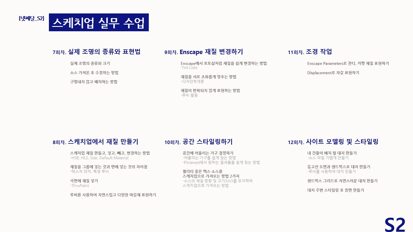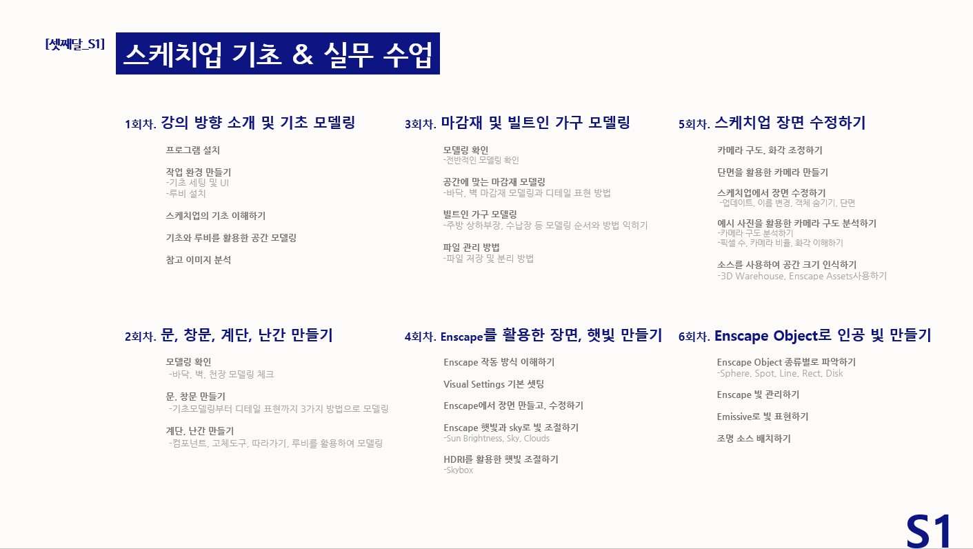 강의목표 | 건축 인테리어 포트폴리오 제작 | 건축 인테리어 포트폴리오 제작 | 캐드 도면 기초 다지기 *초보자 수강 가능 | 스케치업 8주 마스터하기 포트폴리오 완성 *초보자 수강 가능 | BIM 실무 강의 포트폴리오 완성 *초보자 수강 가능 | |||