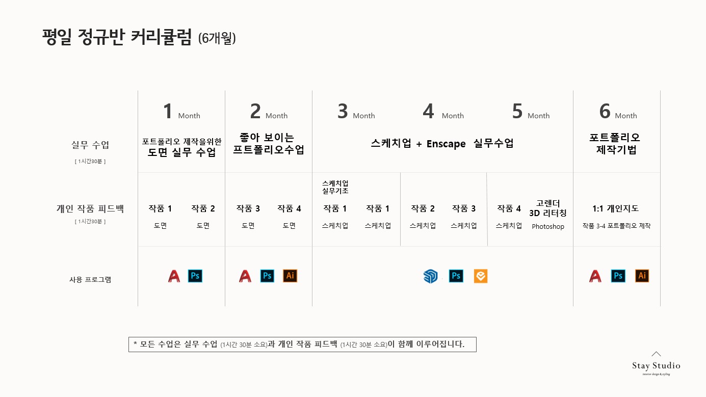 Stay Studio의 모든 수업이 실무 위주로 진행되기 때문에 기초부터 실무에서 쓰는 방식으로 알려드리고 있어요! 기초를 탄탄히 해야 심화과정으로 넘어가서도 문제가 없기 때문에 항상 기본을 자세히 알려드리고 있답니다. 또한 프로그램을 다루어 본 적이 없으신 분들도 잘 따라오실 수 있도록 세세하게 강의를 진행하고 있고, 다들 열심히 하셔서 좋은 결과물을 만들어 내셨답니다.