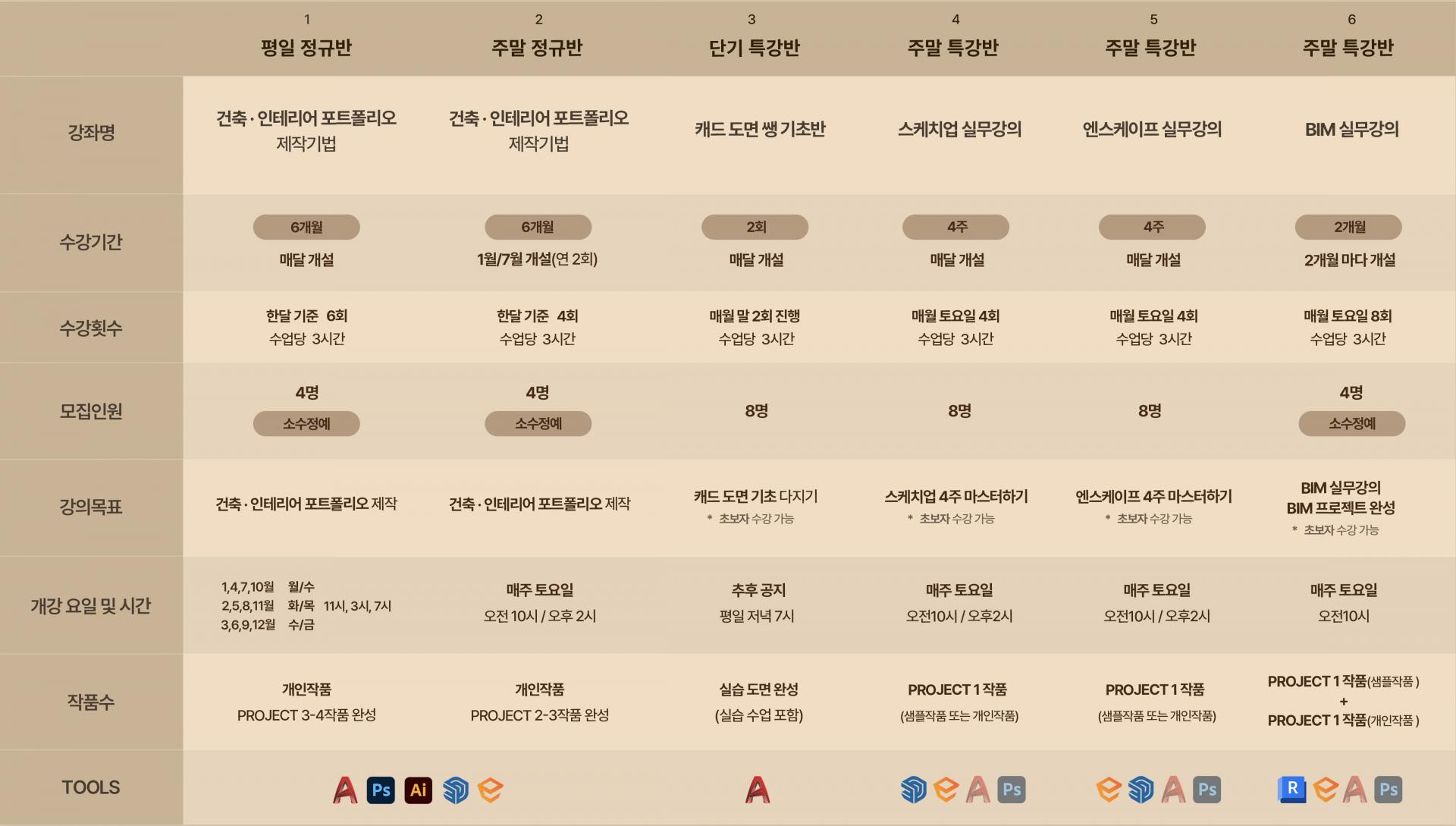 강좌명 | 건축 / 인테리어 포트폴리오 제작기법 | 건축 / 인테리어 포트폴리오 제작기법 | 캐드 쌩 기초반 | 스케치업 실무강의 | BIM 실무강의 | |||